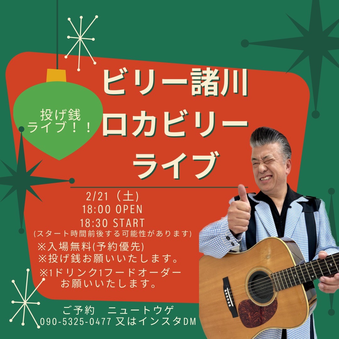 2月21日(土)開催! ビリー諸川氏投げ銭ロカビリーライブ 18:00 オープン 18:30 スタート(スタート時間は前後する可能性がございます) 入場料 無料(投げ銭お願いいたします) 着席イベントの為、ご予約のお客様優先となります ご予約 09053250477